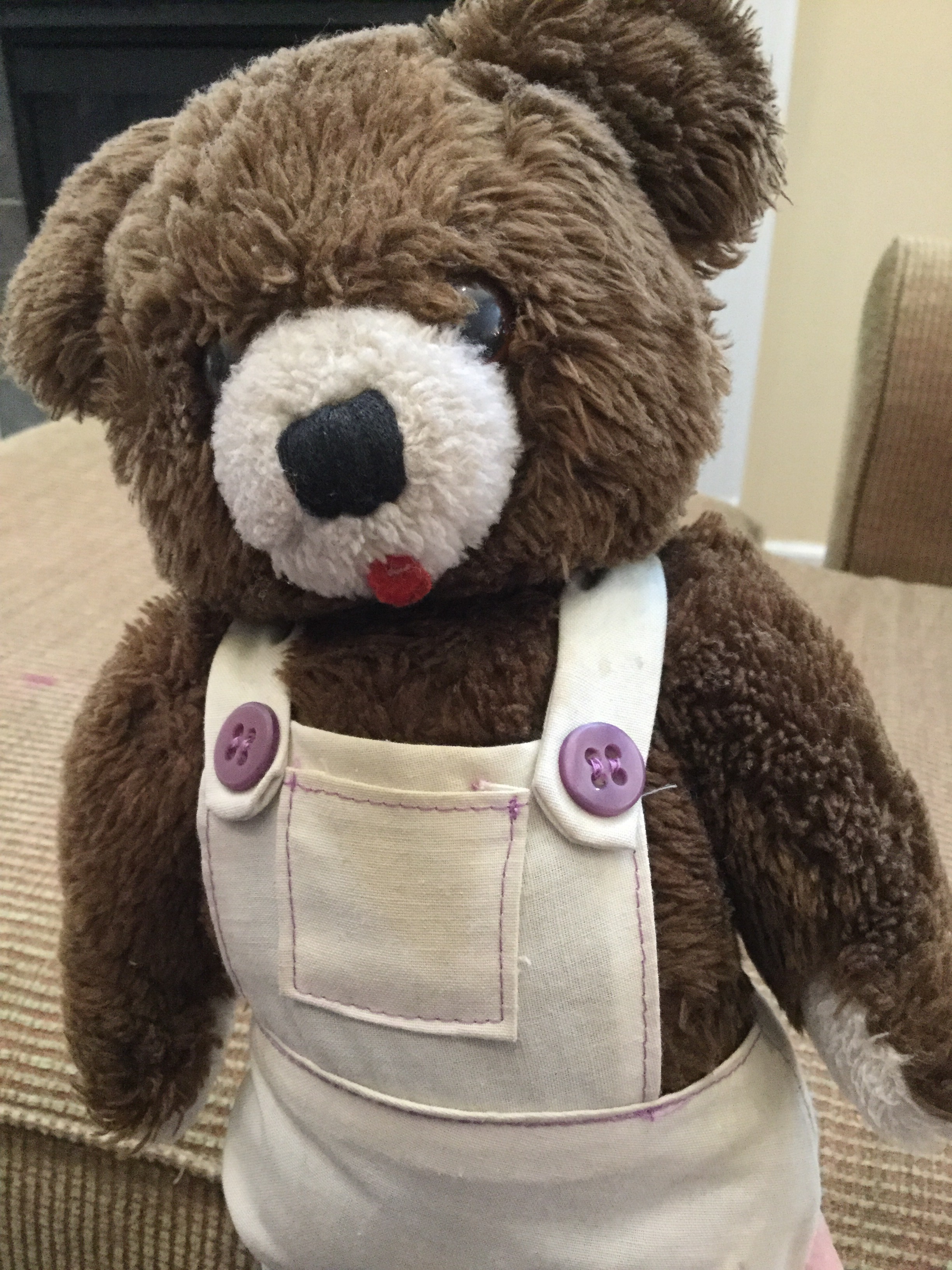 I wasn’t really a teddy bear kid in the sense that I had to sleep with him every night. Mostly he hung out on top of my bed or propped in a corner. I loved him but didn’t pay him much mind. I made those overalls myself when I was about 11 and you can see that I’ve liked purple for a very long time. His music box no longer works and I don’t even remember the tune it played. He has got to be over 40 years old.