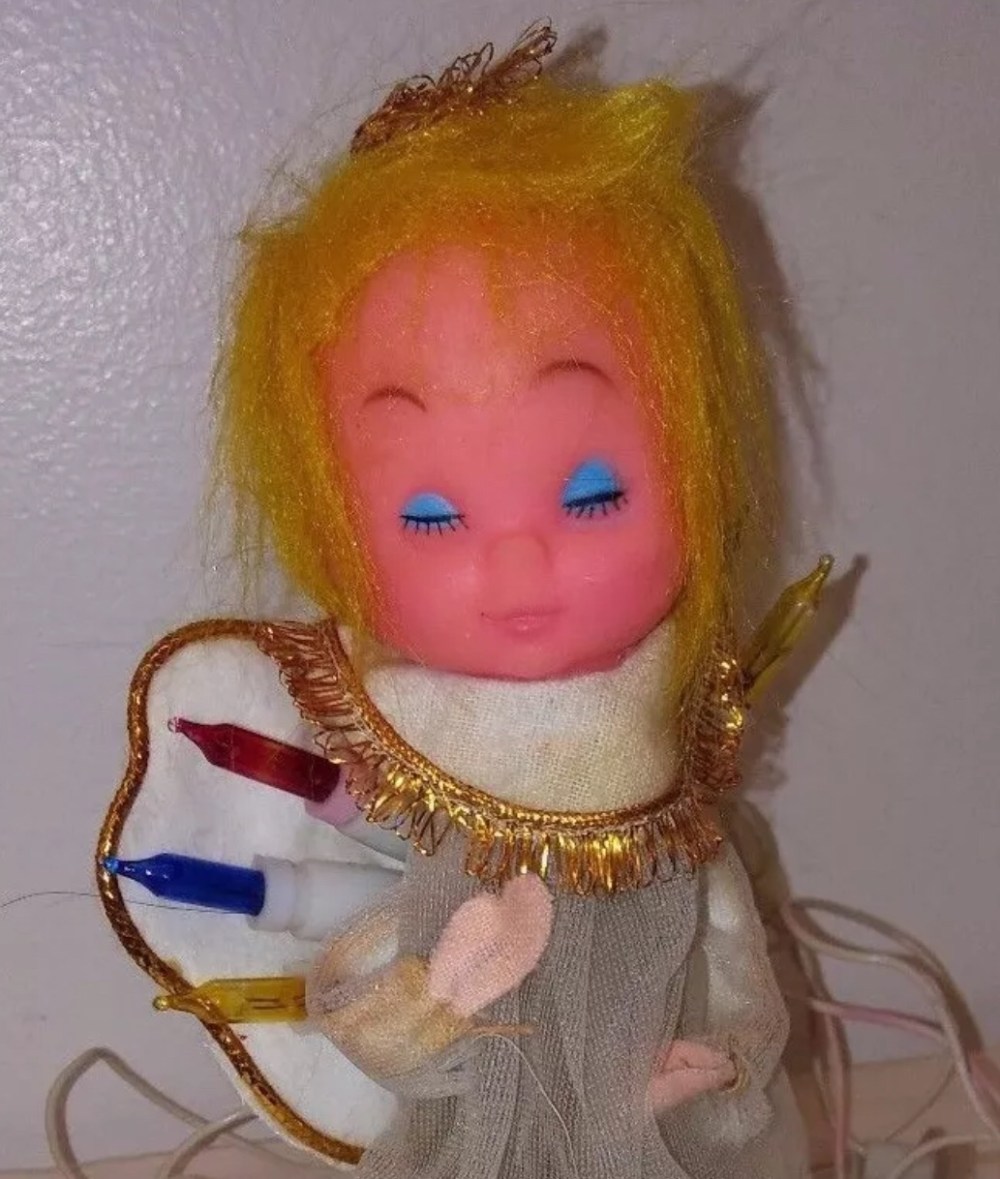 Every year, I tried to straighten her wired wings and arrange the lights evenly under her diaphanous skirt. Each season required a different repair; whether to reinforce the cheap cardboard bottom with scotch tape or to tie her little felt hands together to keep them clasped in prayer. Her hair was a frizzy mess that could not be combed or styled in any way that would be considered presentable on a real, breathing human. Her painted on makeup was bright and garish. She was truly hideous but every year she was carefully placed on top of the psychedelic tree and sat there, slightly tilted, until she was put back into the smashed box until the next December.