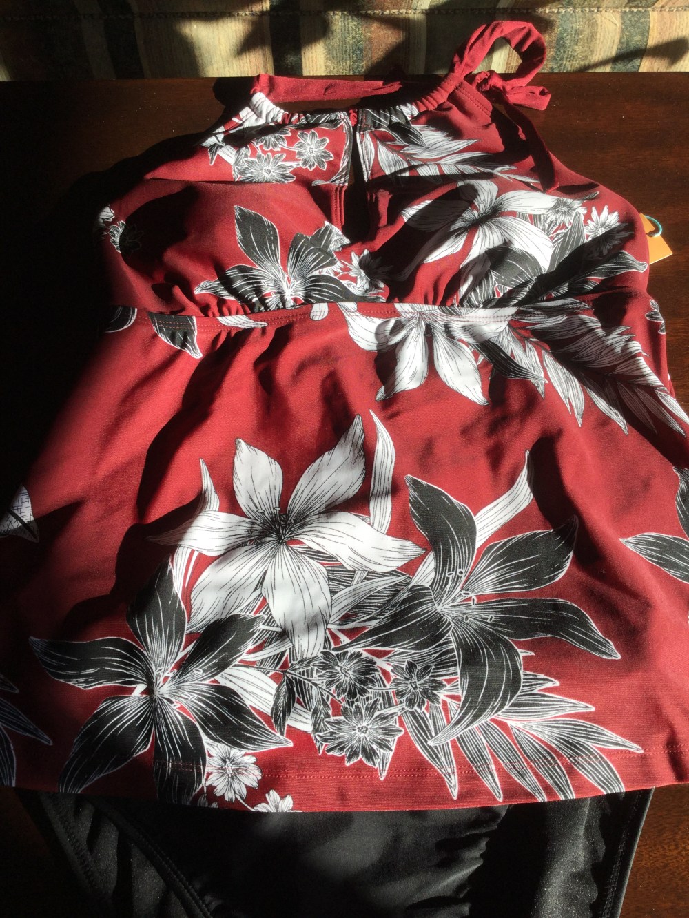 I found a two piece tankini with a less garish print/colors and no boob padding.