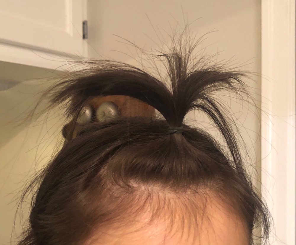As a teenager, whenever my awesome feathered 80s hair wasn’t blown dry and hair sprayed into coiffed perfection, my super straight bangs just flopped around my face. This was an annoyance I absolutely detested and refused to endure. My daughter recently walked out of her room and had no idea why I laughed myself stupid and immediately took a picture (with my cell phone, ha!). There is literally no way she could have known this but, at home in private, I would wear my hair exactly like this!