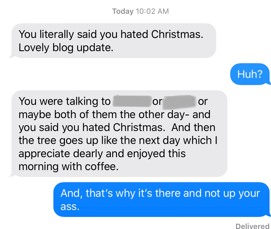 Note: It is 11/10/2020 and I put up that fucking tree yesterday. This is the absolute earliest I have ever lugged the dreaded box out of storage. I blame 2020. The whole world has gone to shit and this year hasn’t been bad enough so why not do something I detest a whole month early?!