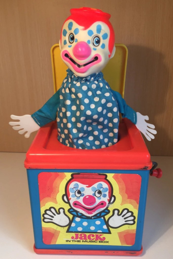 More than the scare, he absolutely HATED trying to get that spring-loaded clown back into the box. Inevitably, the clown’s waving arms with the flat plastic hands stuck out and prevented the lid from latching.